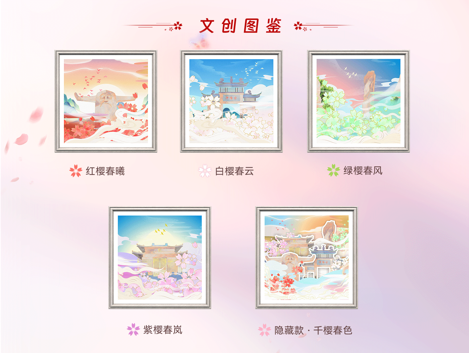 盲盒包含《紅櫻春曦》、《白櫻春云》、《綠櫻春風(fēng)》、《紫櫻春嵐》四款數(shù)字文創(chuàng),總計400000份。購齊此四款者有機(jī)會領(lǐng)取隱藏款《千櫻春色》(限量6000份),隱藏款特定編號的用戶可獲得景區(qū)門票權(quán)益大禮包。