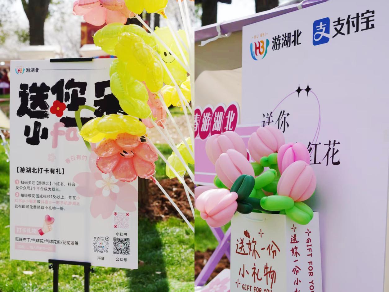活動(dòng)現(xiàn)場(chǎng),游客們只需掃碼關(guān)注“游湖北”新媒體矩陣賬號(hào),并分享賞櫻圖片或視頻至社交平臺(tái),即可獲得旺旺布丁/氣球花/氣球花包/花花發(fā)箍等精美禮品。豐富多樣的禮品引來(lái)眾多賞花游客圍觀打卡,現(xiàn)場(chǎng)圈粉無(wú)數(shù)。