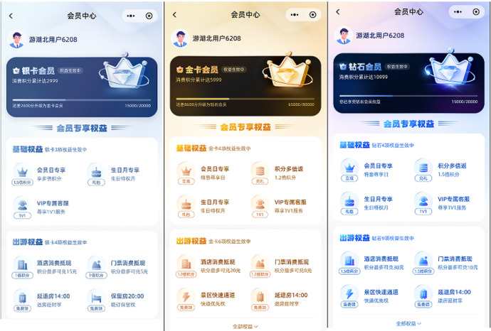 平臺(tái)以消費(fèi)、信用和活躍度為核心要素,會(huì)員通過(guò)消費(fèi)、參與活動(dòng)、打卡等方式獲取成長(zhǎng)值“小旅豆”,完成從銀卡會(huì)員升級(jí)至金卡會(huì)員和鉆石卡會(huì)員的成長(zhǎng),享受不同等級(jí)的專(zhuān)屬折扣、多倍積分、積分當(dāng)錢(qián)花、優(yōu)先預(yù)訂、快速通道、會(huì)員日、生日月、跨境禮包、定制服務(wù)等權(quán)益。