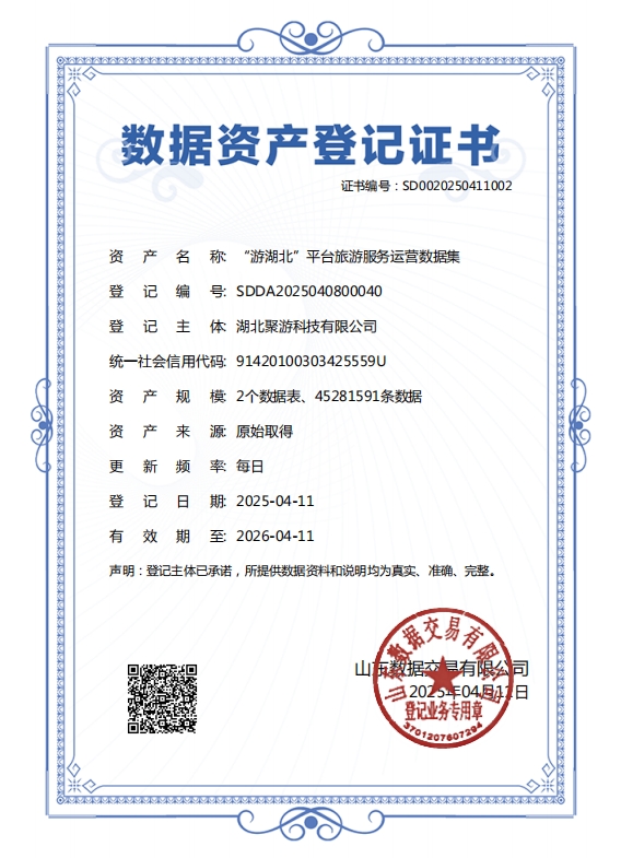 近日,湖北數(shù)字文旅集團旗下聚游科技公司在數(shù)據(jù)資產(chǎn)化領域傳來捷報。4月11日,其研發(fā)的"游湖北平臺旅游服務運營數(shù)據(jù)集"成功取得數(shù)據(jù)資產(chǎn)登記認證。