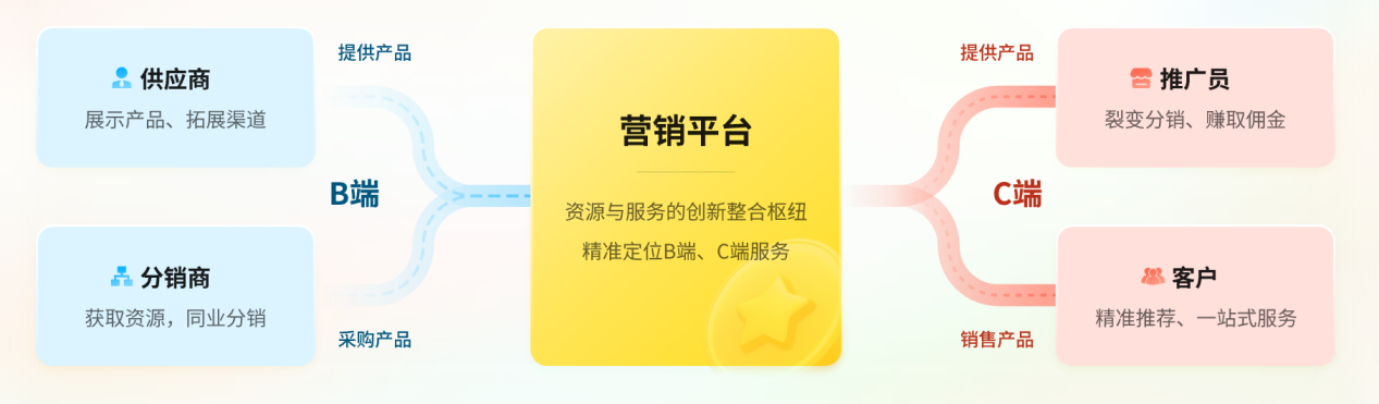 面對這些“散、亂、難”,行業(yè)開始尋找答案:一張能連接一切的“智慧之網(wǎng)”。這張網(wǎng),要能整合分散的資源(B 端供應(yīng)商),打通多元的分銷渠道(B 端分銷商),更要能精準觸達和服務(wù)最終消費者(C 端),形成高效協(xié)同的生態(tài)。它不僅僅是工具,更是賦能運營、激活價值的底層操作系統(tǒng)。