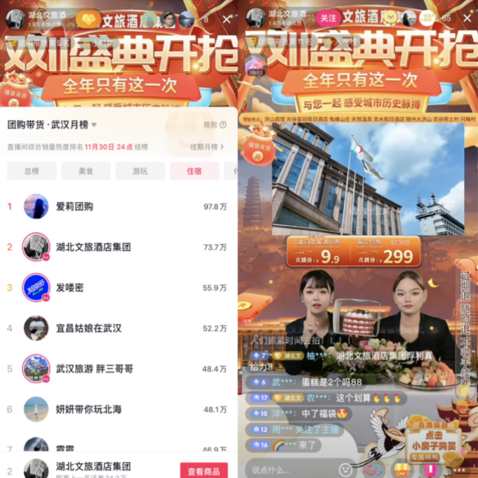 首戰(zhàn)告捷!數(shù)旅集團(tuán)聯(lián)手酒店集團(tuán)“雙十一”直播,躋身武漢團(tuán)購帶貨榜單月榜第2名