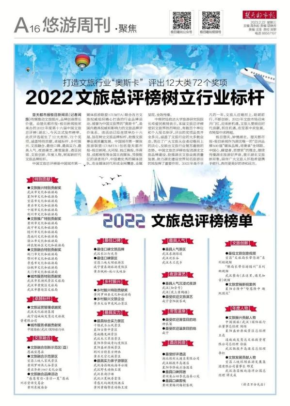 本周熱點 文旅界的“奧斯卡”!古隆中景區(qū)榮獲2022年度中國文旅總評榜“最具綜合實力景區(qū)”等獎項。2月22日,第十六屆中國文旅總評榜正式發(fā)布榜單,古隆中景區(qū)榮獲中國文旅總評榜“2022年度最具綜合實力景區(qū)”、“2022年度文旅營銷新銳案例”。中國文旅總評榜是在中國文旅品牌(博鰲)論壇背景下,由中國城市第一媒體文旅聯(lián)盟(CUMTA)聯(lián)合各方文旅權威組織精心打造的行業(yè)品牌活動,被譽為中國文旅界的“奧斯卡”獎,是國內(nèi)最具權威和影響力的文旅品牌評價體系。活動自2022年11月啟動以來,共收到數(shù)百個單位和個人的報名資料,經(jīng)評審委員會專家審定,最終誕生了12大類別、72個獎項,涵蓋文旅局、景區(qū)、旅游目的地、旅行社、酒店民宿、鄉(xiāng)村振興、演藝夜游、文旅推廣、年度人物等。襄陽古隆中景區(qū)開創(chuàng)了新的文旅融合發(fā)展格局,利用新媒體矩陣,持續(xù)舉辦了多場新媒體活動,在全國范圍展示了深厚的三國文化底蘊,展示了湖北文旅新形象。 清江畫廊公司榮獲2022年度中國景區(qū)影響力品牌“年度創(chuàng)新山水型景區(qū)”稱號。 近日,2022年中國文旅產(chǎn)業(yè)投資運營大會在湖北武漢召開,大會上公布了2022年度中國景區(qū)影響力品牌榜單,清江畫廊景區(qū)榮獲“年度創(chuàng)新山水型景區(qū)”稱號。2022年度中國景區(qū)影響力品牌排名是通過監(jiān)測景區(qū)在互聯(lián)網(wǎng)和移動互聯(lián)網(wǎng)的搜索、運營、媒體、點評指數(shù),綜合分析計算得出MBI/MCI指數(shù)排名,來反映一段時間內(nèi)景區(qū)在全國的品牌影響力,通過海量真實數(shù)據(jù)制作榜單。清江畫廊景區(qū)的入選,也代表著文旅行業(yè)正在不遺余力的推進文化和旅游產(chǎn)業(yè)鏈合作進程,推進企業(yè)跨越式發(fā)展,努力為市場提交一份滿意的答卷。 海外(中旅)研學百人團首發(fā)啟動。以研學為途徑,博學而篤志;以自然為媒,躬行求知。2月15日,海外(中旅)集團研學中心帶領330余名學子們來到了農(nóng)耕年華研學基地,一場最美的研學際遇在等待著他們。2023新春首次啟動勞動教育研學之旅,共計330余名小學學子們,在海外(中旅)集團研學中心與學校的共同組織下,將一年級至六年級的學子們劃分為兩個團隊,一至三年級以國學與農(nóng)事為主,將中華國學與農(nóng)事生產(chǎn)文化代代相傳,既豐富了勞動體驗,又積累了國學底蘊。四至六年級以手工與農(nóng)耕為主,從小養(yǎng)成熱愛勞動,勤于實踐,珍惜糧食,懂得感恩的優(yōu)秀品德并受益終生。 最新資訊 ● 甘肅寧夏攜手打造“大西北”文旅IP。寧夏回族自治區(qū)文化和旅游廳與甘肅省文化和旅游廳在甘肅蘭州進行座談交流,共商大西北文旅抱團發(fā)展、做大做強大西北文旅品牌,合力促進文旅消費復蘇等事宜。根據(jù)會議消息,甘肅省文旅廳將全力支持寧夏文旅廳提出的關于“共商籌備第二屆大西北文旅高峰會、市場化發(fā)行西北旅游一卡通、成立西北生態(tài)康養(yǎng)旅游聯(lián)盟、做大做強大西北文旅品牌”等合作事宜和相關業(yè)務工作;寧夏文旅系統(tǒng)將著力加強戰(zhàn)略協(xié)作,精誠推進全面融合,共同打造好“大西北”這個獨特而共有的超級文旅大IP,深度推進與兄弟省區(qū)的合作,共同提振旅游經(jīng)濟,大力促進文旅復蘇發(fā)展,合力推動雙方文旅系統(tǒng)在更大范圍、更寬領域、更深層次開創(chuàng)務實合作新局面。 ● 成都高質量打造文旅經(jīng)濟發(fā)展核心區(qū)推動世界文化名城建設。2月22日,成都市文化廣電旅游局發(fā)布《高質量打造全省文旅經(jīng)濟發(fā)展核心區(qū)推動世界文化名城建設行動方案》。到2025年,力爭實現(xiàn)成都市文創(chuàng)產(chǎn)業(yè)增加值3100億—3400億元,占GDP比重達到12%以上,旅游接待游客達到3.5億人次,總收入達到6300億元,文化產(chǎn)業(yè)增加值占全省比重達到53%,旅游總收入占全省比重增長到39%。實施文創(chuàng)、旅游企業(yè)梯度培育計劃,支持本土龍頭企業(yè)上市及沖刺全國文化企業(yè)30強、中國旅游集團20強,實現(xiàn)省級文化和旅游產(chǎn)業(yè)優(yōu)秀龍頭企業(yè)達到15家以上。 ● 長沙打造文旅業(yè)“復原力” 發(fā)放400萬元消費券。長沙市文化旅游廣電局制定出臺了《關于促進文旅產(chǎn)業(yè)穩(wěn)定發(fā)展的若干措施》,旨在打造文旅業(yè)“復原力”,全面促進文化和旅游市場高質量發(fā)展。將舉辦“長沙有喜 福滿星城”消費季,發(fā)行全國唯一由政府搭臺、市場運作、文旅商融合的生活服務類折扣卡——“長沙城市嗨卡”。通過攜程平臺發(fā)放400萬元文旅消費券。聯(lián)動全市四個國家級夜間文旅消費集聚區(qū)開展系列促消費活動。支持各市場主體發(fā)展消費新業(yè)態(tài)、打造消費新場景。結合四季主題消費活動,發(fā)布旅游精品線路。舉辦第二屆全市旅游發(fā)展大會。 ● 桂林部署打造世界級旅游品牌。近日,桂林市第六屆人民代表大會第四次會議召開。根據(jù)會議報告內(nèi)容,桂林將持續(xù)推進“一城一都一地一中心”建設,加快建設世界級山水旅游名城、世界級文化旅游之都、世界級康養(yǎng)休閑勝地、世界級旅游消費中心。同時,全力推動文旅產(chǎn)業(yè)回