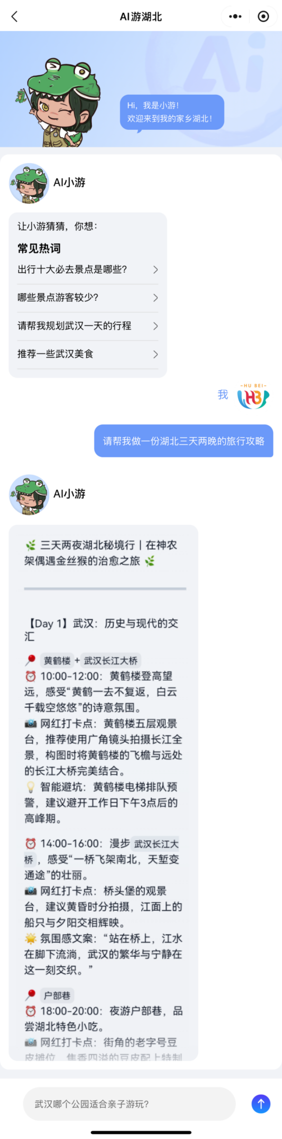 接入DeepSeek,湖北文旅集團實現(xiàn)人工智能技術(shù)深度應(yīng)用重大突破。在湖北文旅集團數(shù)智化戰(zhàn)略的驅(qū)動下,數(shù)旅集團深入推進人工智能技術(shù)深度應(yīng)用項目。近日,“游湖北”平臺上線“AI游湖北”板塊,無論是行程規(guī)劃、景點介紹,還是實時天氣查詢、景區(qū)客流預(yù)警,都能輕松實現(xiàn)。自2024年第四季度項目啟動以來,技術(shù)團隊巧妙借助國產(chǎn)大模型DeepSeek的強大效能,一舉斬獲兩項重大突破:搭建企業(yè)級知識庫系統(tǒng)、完成智能旅游行程助手設(shè)計,為文旅行業(yè)的智能化變革注入了澎湃新動能。未來,數(shù)旅集團將繼續(xù)深化人工智能技術(shù)的應(yīng)用,探索更多創(chuàng)新場景,推動文旅行業(yè)的數(shù)字化轉(zhuǎn)型,為用戶創(chuàng)造更優(yōu)質(zhì)的智能化服務(wù)體驗。