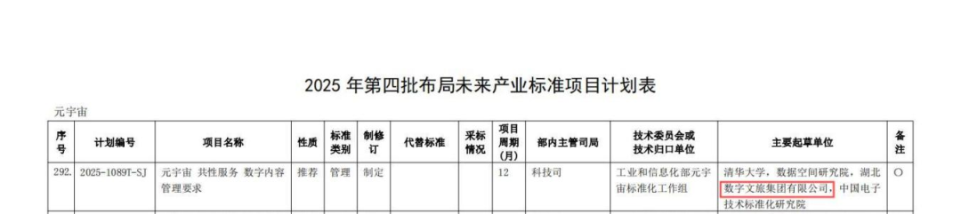 數(shù)旅集團(tuán)標(biāo)準(zhǔn)建設(shè)取得新成果——參編行業(yè)標(biāo)準(zhǔn)入選工信部計(jì)劃。近日,數(shù)旅集團(tuán)參編的《元宇宙共性服務(wù)數(shù)字內(nèi)容管理要求》成功入選工業(yè)和信息化部2025年第四批行業(yè)標(biāo)準(zhǔn)制修訂計(jì)劃——布局未來產(chǎn)業(yè)標(biāo)準(zhǔn)項(xiàng)目計(jì)劃。此次入選,標(biāo)志著數(shù)旅集團(tuán)在元宇宙標(biāo)準(zhǔn)化建設(shè)方面取得新進(jìn)展,也為推動構(gòu)建可信、有序的元宇宙生態(tài)提供重要參考。未來,數(shù)旅集團(tuán)將持續(xù)深化國有企業(yè)改革,充分發(fā)揮“科改企業(yè)”創(chuàng)新主體作用,通過“標(biāo)準(zhǔn)引領(lǐng)、創(chuàng)新驅(qū)動”的發(fā)展路徑,不斷完善標(biāo)準(zhǔn)化工作體系,為文旅產(chǎn)業(yè)高質(zhì)量發(fā)展提供堅(jiān)實(shí)支撐。